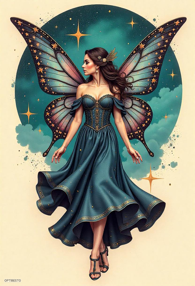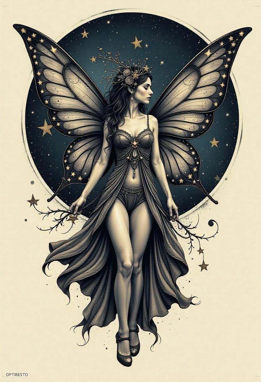 - A fairy with cosmic elements, such as a starry night background or moon phases encircling her.