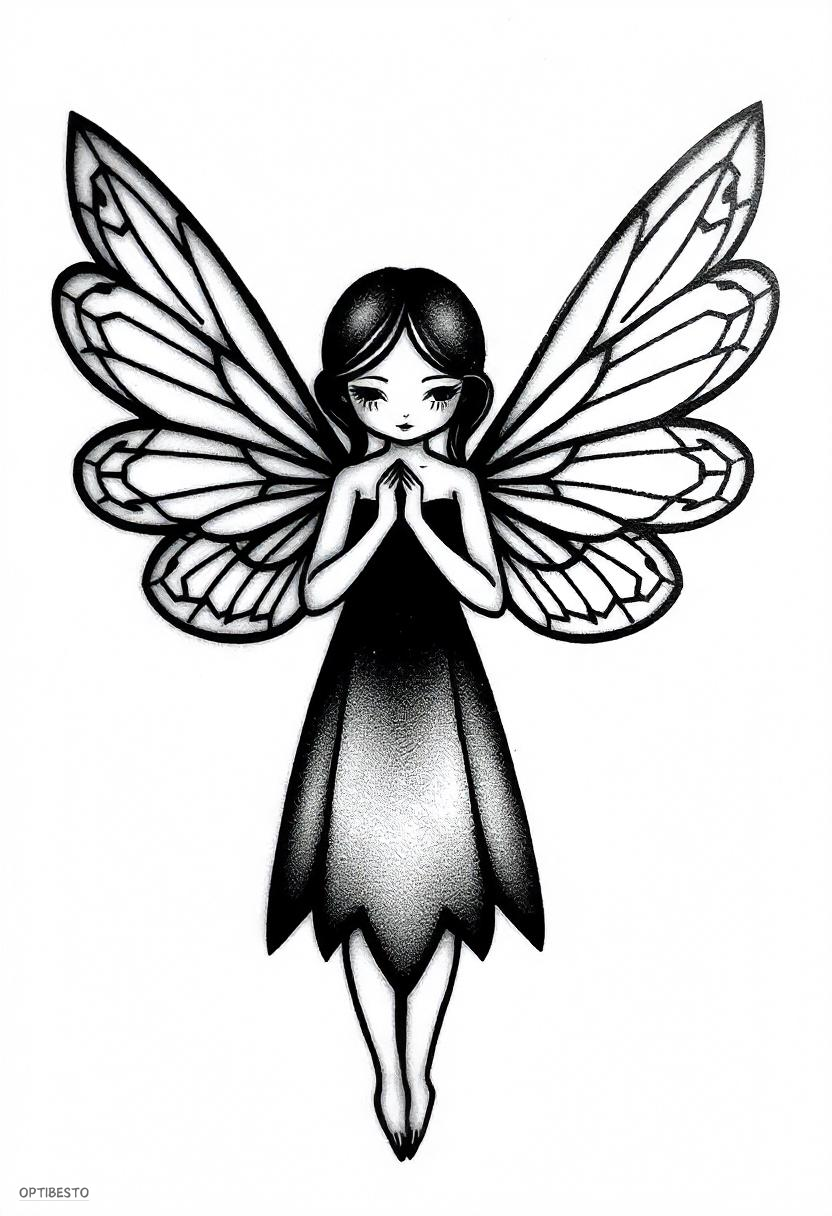 - A simple outline of a fairy with minimal shading, focusing on clean lines and geometric shapes.