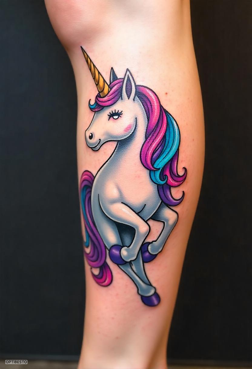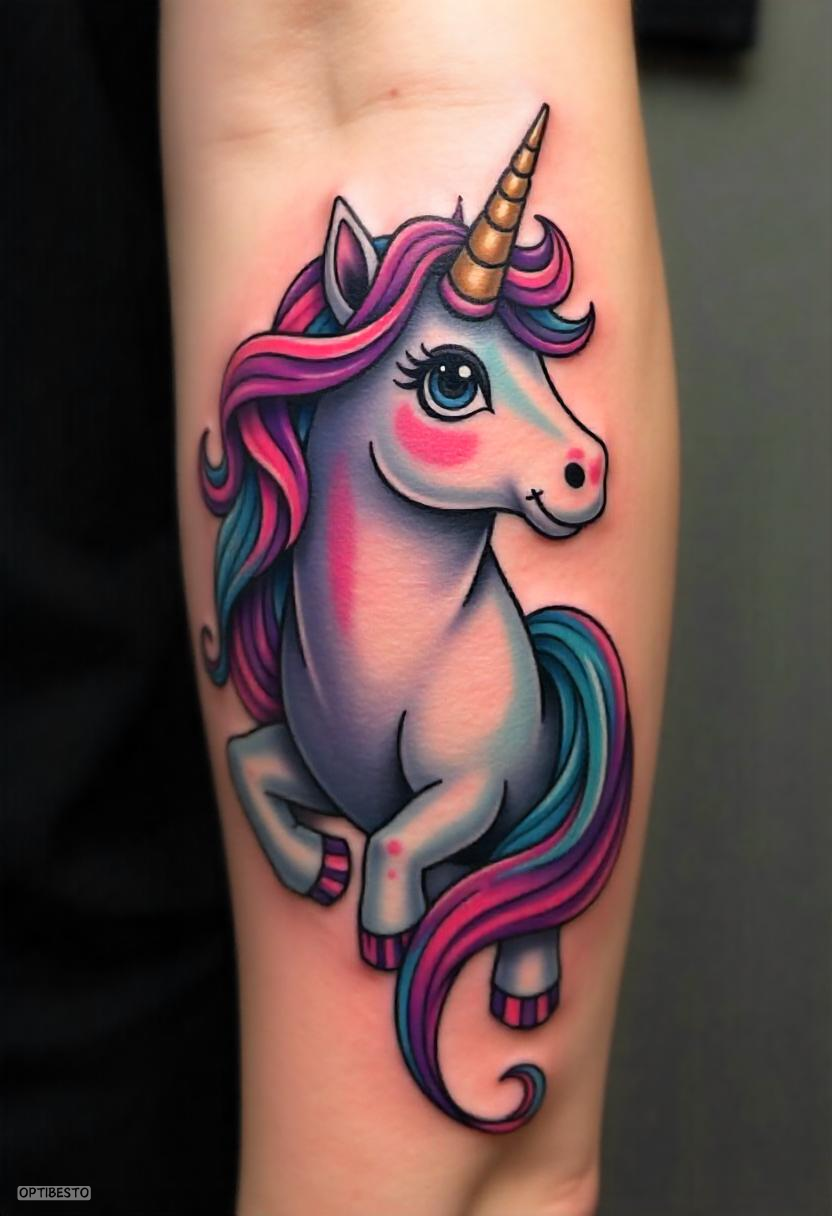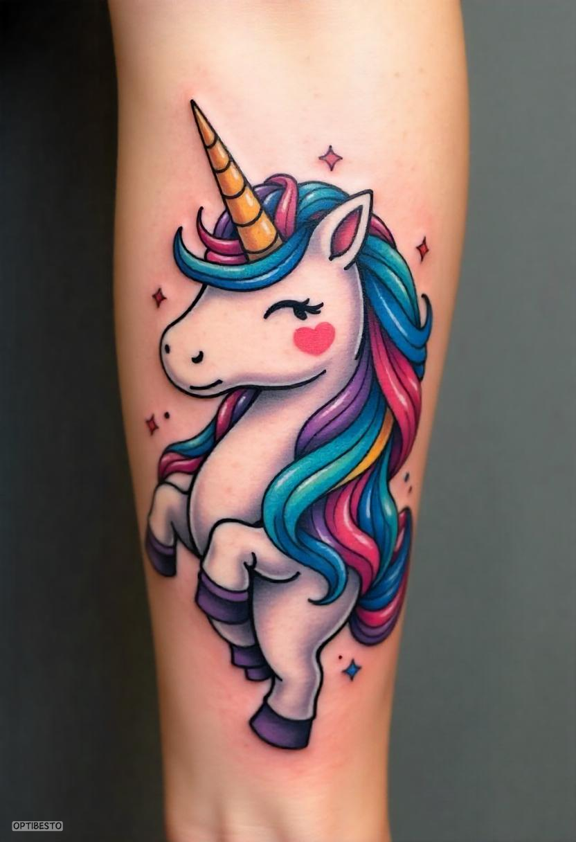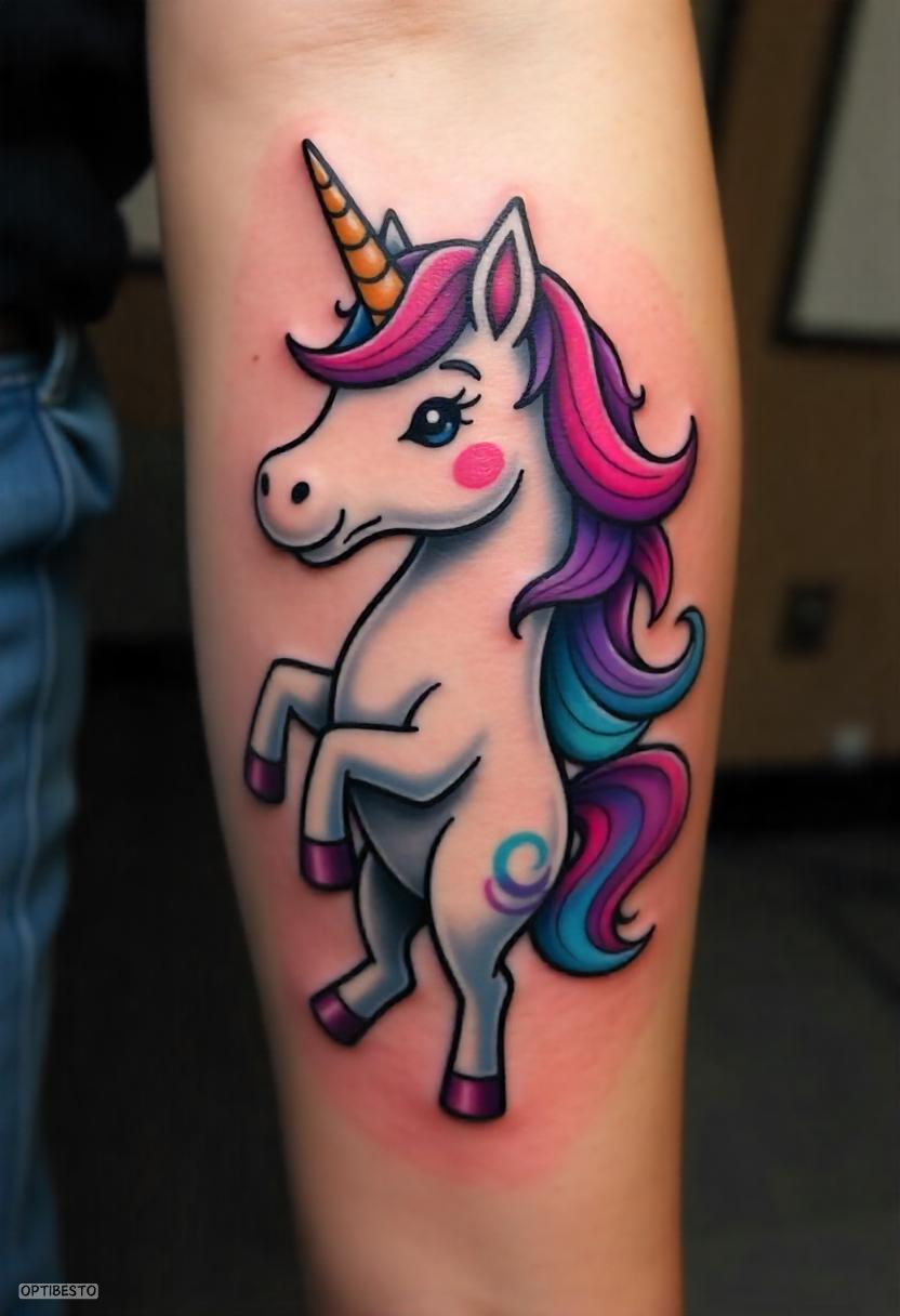 Playful and colorful, cartoon-style unicorn tattoos exude fun and positivity. They are often chosen by individuals who want to celebrate their childlike wonder and lighthearted spirit.