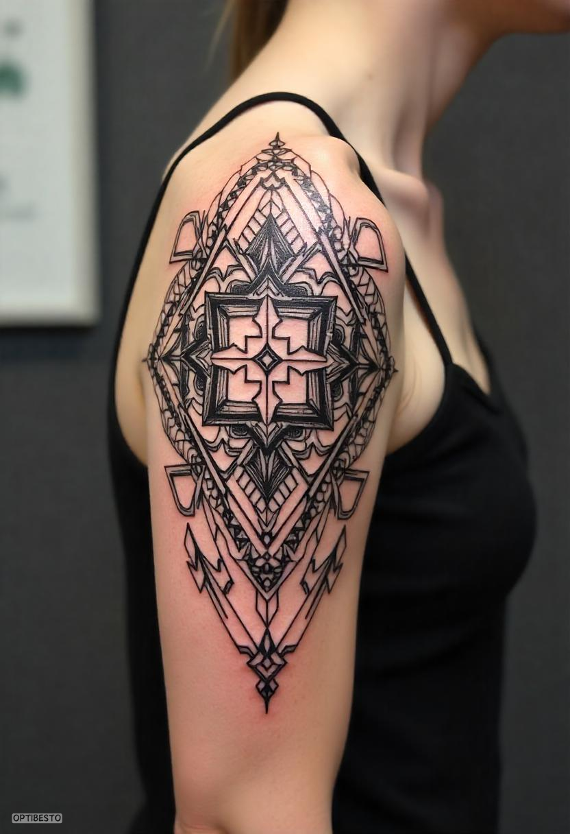 Geometric patterns often feature intricate linework and can include sacred geometry shapes like Metatron’s Cube or hexagons. These tattoos can extend to other parts of the body for a dynamic effect.